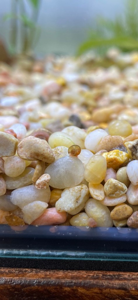 A week later I noticed a tiny snail the size of a pinhead crawling up the side of the tank. Enter: Hermes.