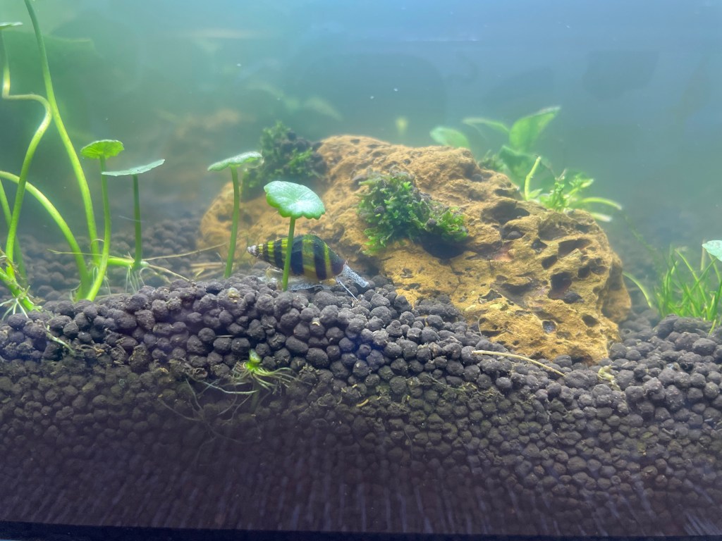 I introduced Helen and Claude to eat smaller snails, hoping that they would keep up with the population growth – and what a fantastic job they have done! They spend their days gobbling up little snails and cruising around the tank. Their yellow and black striped shells make them highly distinguished in the tank, and they move much quicker than I anticipated.