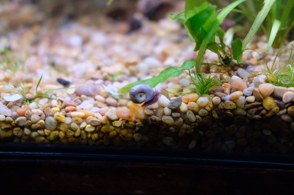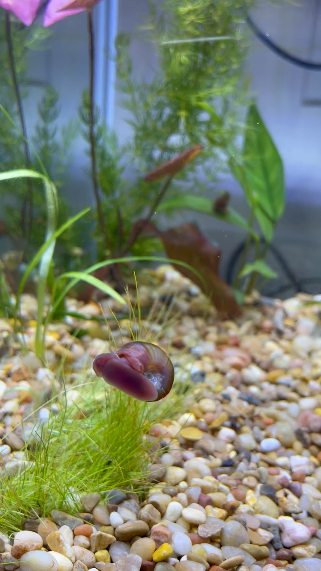 Hellen is a highly active assassin snail. She spends her days (and nights) roaming the tank for smaller ramshorn snails to snack on.